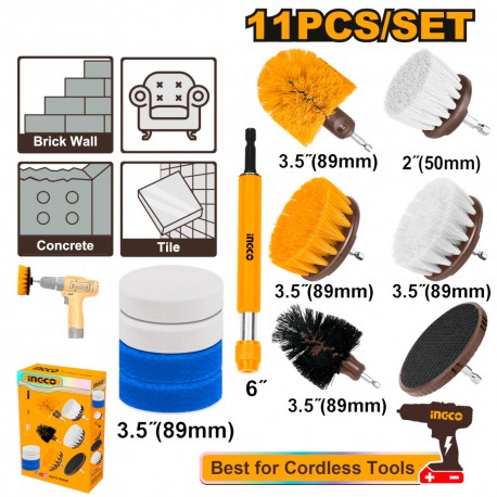 Include: • 1 spazzola a setole morbide da 2″ • 1 spazzola a setole morbide da 3,5″ • 1 spazzola a setole medie da 3,5″ • 1 spazzola a 360° a setole medie • 1 spazzola a 360° a setole abrasive • 1 supporto / prolunga da 6″ • 2 tamponi / spugne da 3,5″ • 2 pad abrasivi da 3,5″ (scour pads) • 1 disco / supporto “backer pad